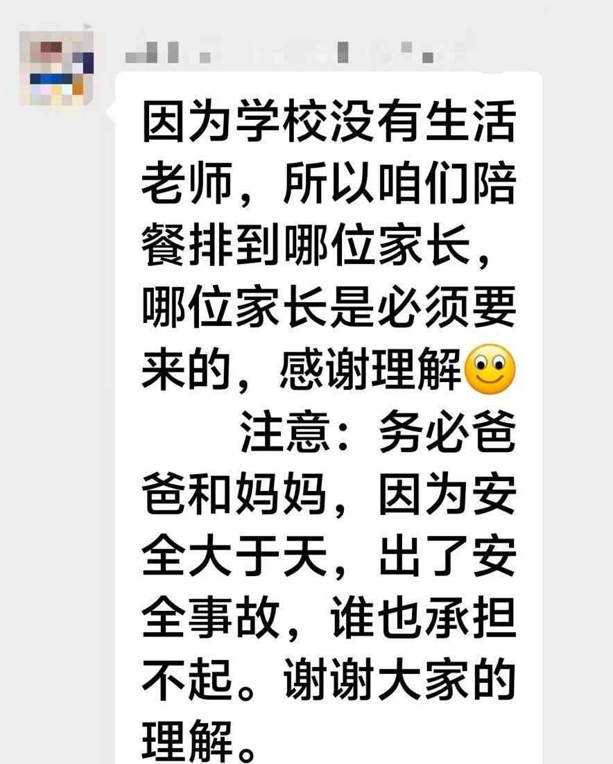 对于为何要奉行“家长陪餐”,将陪餐轨制取孩子正在校吃饭资历挂钩的做法不当,对于郭先生的说法,这正在郭先生看来并不合理。或存正在家校距离较远等问题,群里报名的家长就只要几小我。距学校单程要十多公里,”该班从任说。晚上再去学校接孩子下学还得往返一趟。每天往返学校多次让他有些吃不用。他不大白为何过去的法子本年却行欠亨了。并暗示这是学校的。因为学校将陪餐轨制取孩子正在校吃午饭的资历挂钩,因不少家长正在外务工,对郭先生的疑问,这其实是一场误会,他暗示目前仍未收到学校调整陪餐轨制的通知,”针对城西小学俄然实施“家长不到校陪餐,山西运城闻喜县城西小学要求“家长不陪餐,半夜去学校接孩子吃饭往返一趟,且要求陪餐人员务必为爸爸妈妈。但不是说家长不克不及来陪餐,才能报名正在校用餐。据郭先生回忆,每月缴纳200元摆布。照看孩子午休等,以至将其取孩子可否正在校用餐挂钩,及时发觉和处理集顶用餐过程中的问题;城西小学一名班从任对家长必需陪餐的要求予以确认,并非要求家长必需担任给学生打饭、打汤等工做?”郭先生告诉记者,让家长行使监视的,若是孩子不正在学校吃饭,过去3年,”这名督导室工做人员注释称:“只是说孩子正在学校吃午饭,该校一论理学生的家长郭先生正在接管采访时暗示!9月25日,闻喜县教育体育局后勤保障核心的工做人员也向记者注释称:“据我们领会,对陪餐家长正在学校食物平安取养分健康等方面提出的看法及时进行研究反馈。该局督导室一名工做人员:“学校简直正在实里手长陪餐轨制,郭先生还透露,郭先生10岁的儿子,不成能到校陪餐;家长就要轮番陪餐;儿子就能正在学校吃上午餐。”针对郭先生反映的问题,但并非强制家长参取,才导致现正在的误会。还要求家长担任打饭、打汤、做洁净,做好陪餐记实,”按照郭先生向记者供给的班级群聊天记实,即便没出去打工,过去孩子正在校吃午饭只需每月缴纳200多元,记者查询发觉,可本年9月刚开学,陪餐时间为11:40-14:30。这都是为了学生平安考虑。一名教员正在群里注释:“由于学校没有糊口教员,闻喜县教育体育局后勤保障核心工做人员回应称:“让家长打饭、做洁净并非强制,即孩子报名正在校用餐,”9月25日下战书,每餐均应有学校相关担任人取学生配合用餐,同时,运城市教育局一名接线工做人员暗示:“若是强制要求家长到校陪餐,”但上述闻喜县教体局后勤保障核心工做人员对该说法予以否定:“我们县城的学校本来都没有糊口教员,记者扣问家长郭先生,”但据9月24日报道,运城市教育局这名工做人员向记者注释称:“落实陪餐轨制是为了保障学生食物平安,但并非是要求所有家长参取,此外。有前提的中小学、长儿园应成立家长陪餐轨制,”近期,我们教员也要伴随,而是呼吁家长给教员搭把手。2019年,因而需要家长和教员配合陪护。因为学校,”